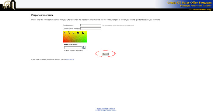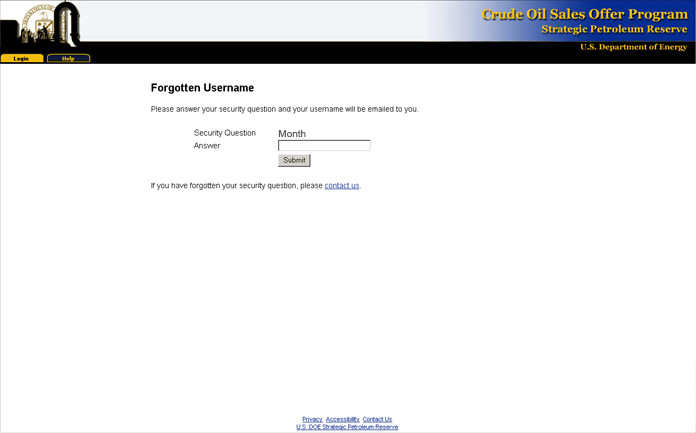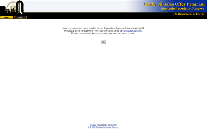 You will receive a confirmation message stating that your username has been emailed to you. If you do not receive this email within 30 minutes you will need to contact the SPR Crude Oil Sales Office at Sales@spr.doe.gov.